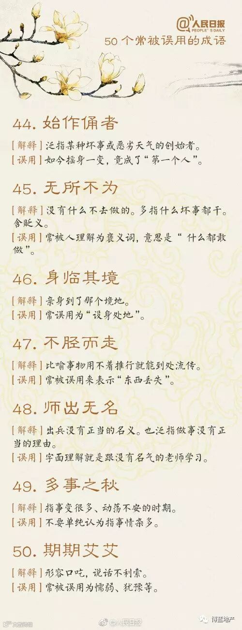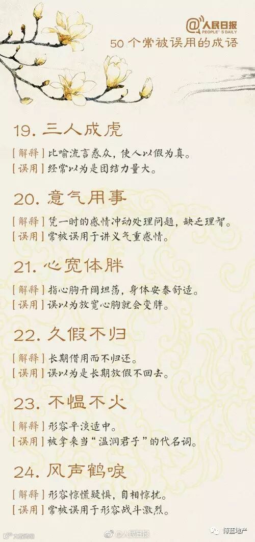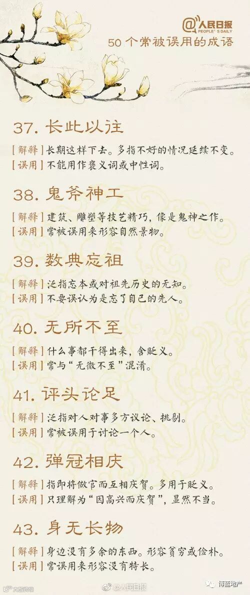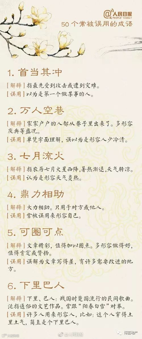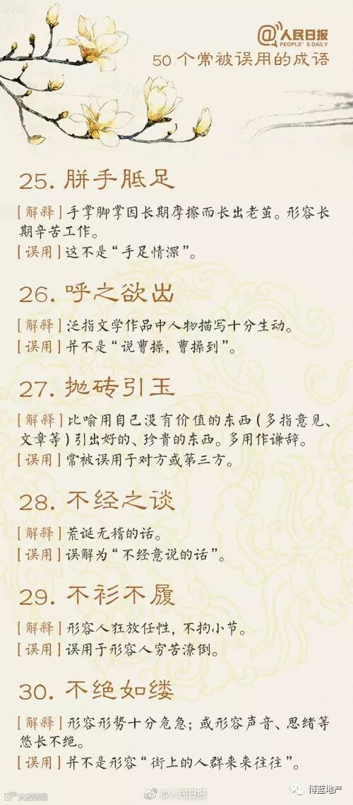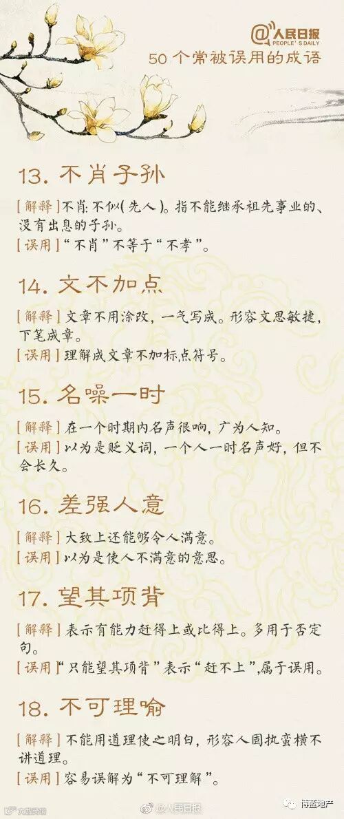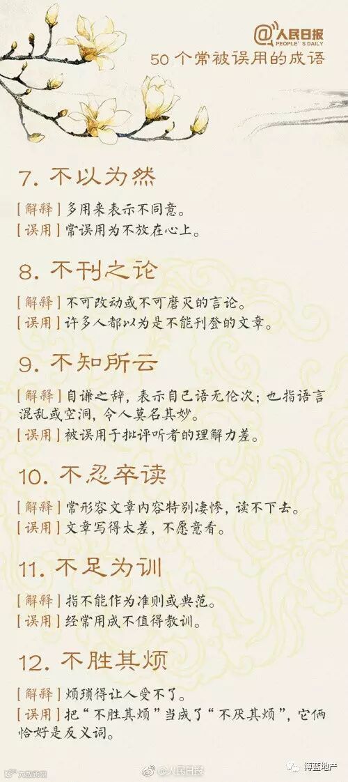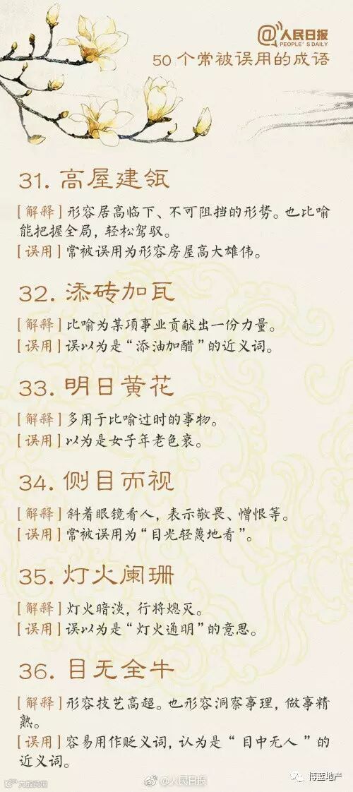 【长知识!这50个易误用的成语,你都知道吗?】①灯火阑珊:灯火暗淡,行将熄灭;②明日黄花:多用于比喻过时的事物;③侧目而视:斜着眼镜看人,表示敬畏、憎恨等;④不衫不履:形容人狂放任性,不拘小节;⑤弹冠相庆:指即将做官而互相庆贺,多用于贬义…50个易误用的成语↓↓补节语文课,转起学习!