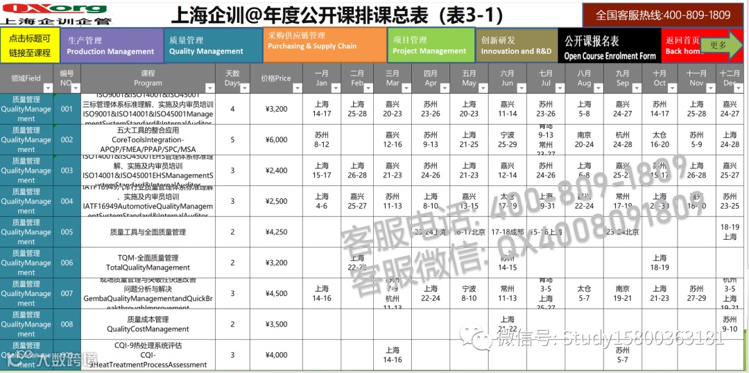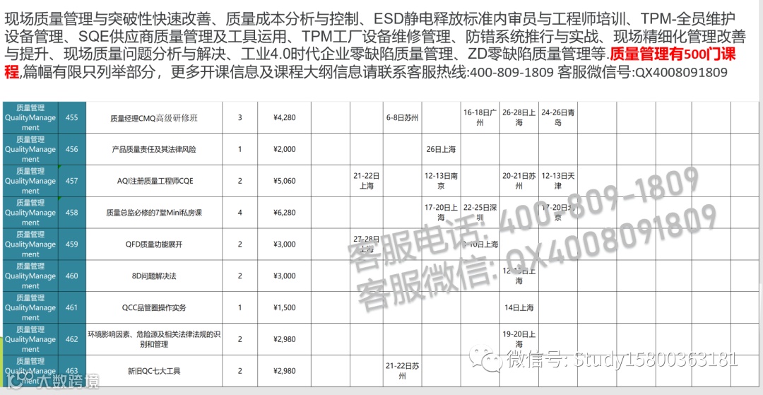 我司携手各大培训机构,定期主办或联合举办主题丰富的公开课.这些课程大多在一线城市开设,如上海、苏州、无锡、常州、南京、合肥、嘉兴、杭州、宁波、南昌、武汉、广州、深圳、北京、青岛、大连、长春、西安、重庆和成都等地. 课程时长多样,既有2-3天的长期课程,也有1天的短期课程,甚至包括5-7天的短期培训.如需了解更多关于课程的信息,欢迎随时通过客服微信号:QX4008091809或全国客服热线:4008091809与我们联系.