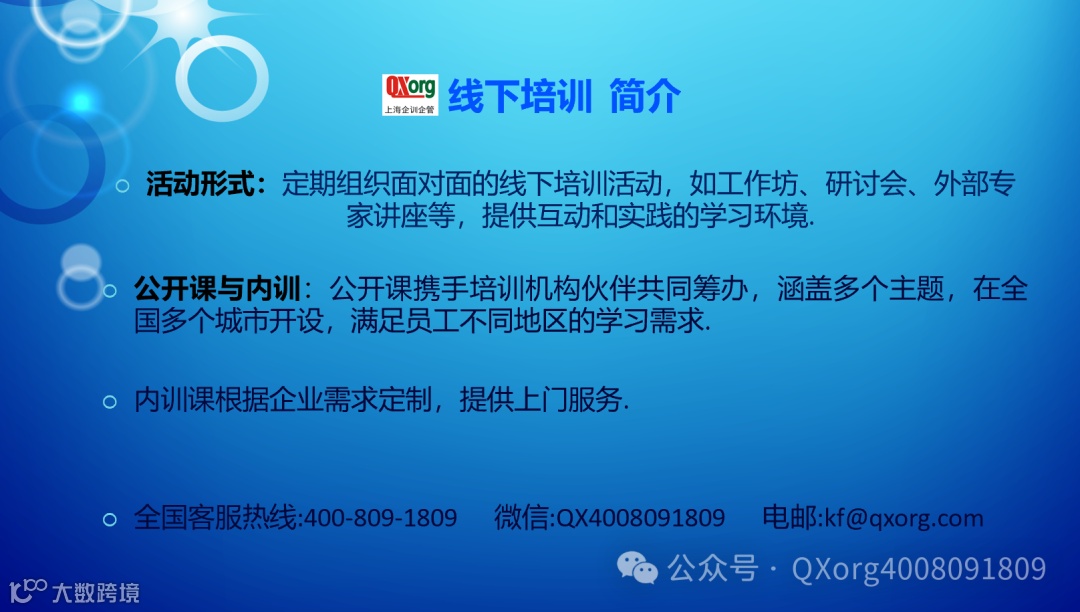 您有任何培训需求,只需轻点左下角的“阅读原文"即可方便地提交您的培训诉求。我们的专业客服团队会在收到您的诉求后的两个工作日内与您取得联系,确保您的需求得到迅速响应.如果您急于寻求帮助,也可直接通过客服微信号:QX4008091809与我们取得联系.