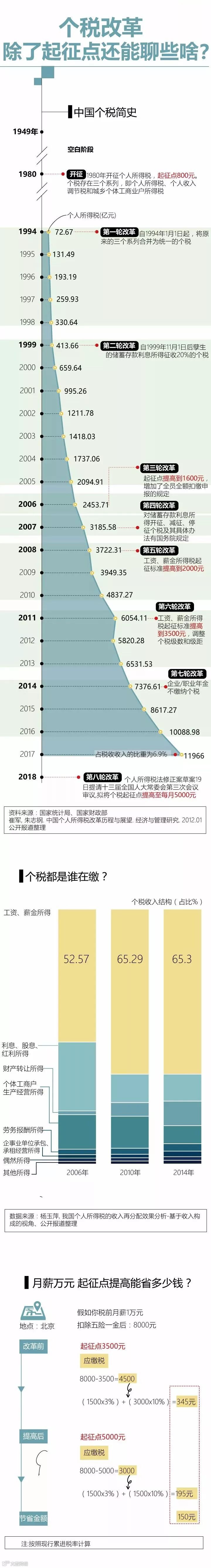 迄今为止,中国个税制度已经经历了八轮改革,个人所得税是目前我国仅次于增值税、企业所得税的第三大税种,在筹集财政收入、调节收入分配方面发挥着重要作用。根据财政部数据显示,2017年全国个税收入达11966亿元。