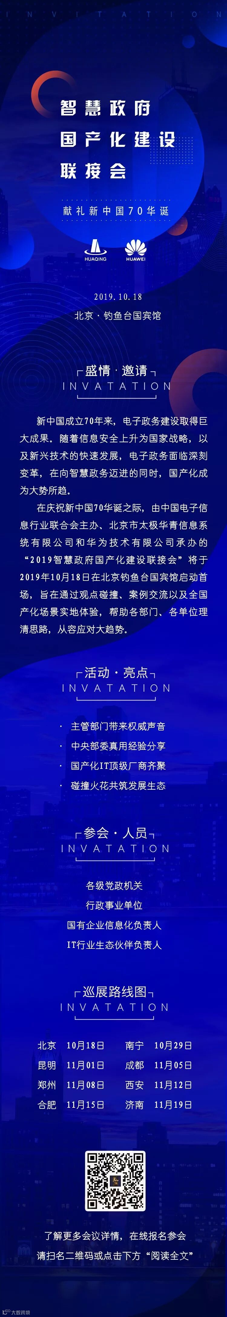 导读:由中国电子信息行业联合会主办、北京市太极华青信息系统有限公司和华为技术有限公司承办的“2019智慧政府国产化建设联接会”将于2019年10月18日在北京钓鱼台国宾馆启动首场。