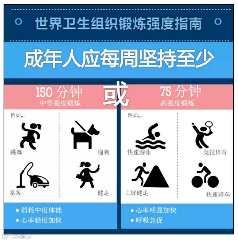世界卫生组织建议,成人最好每周至少进行150分钟的中等强度身体活动,或75分钟的高强度身体活动,低于这个标准的人即被认为是身体活动不足。