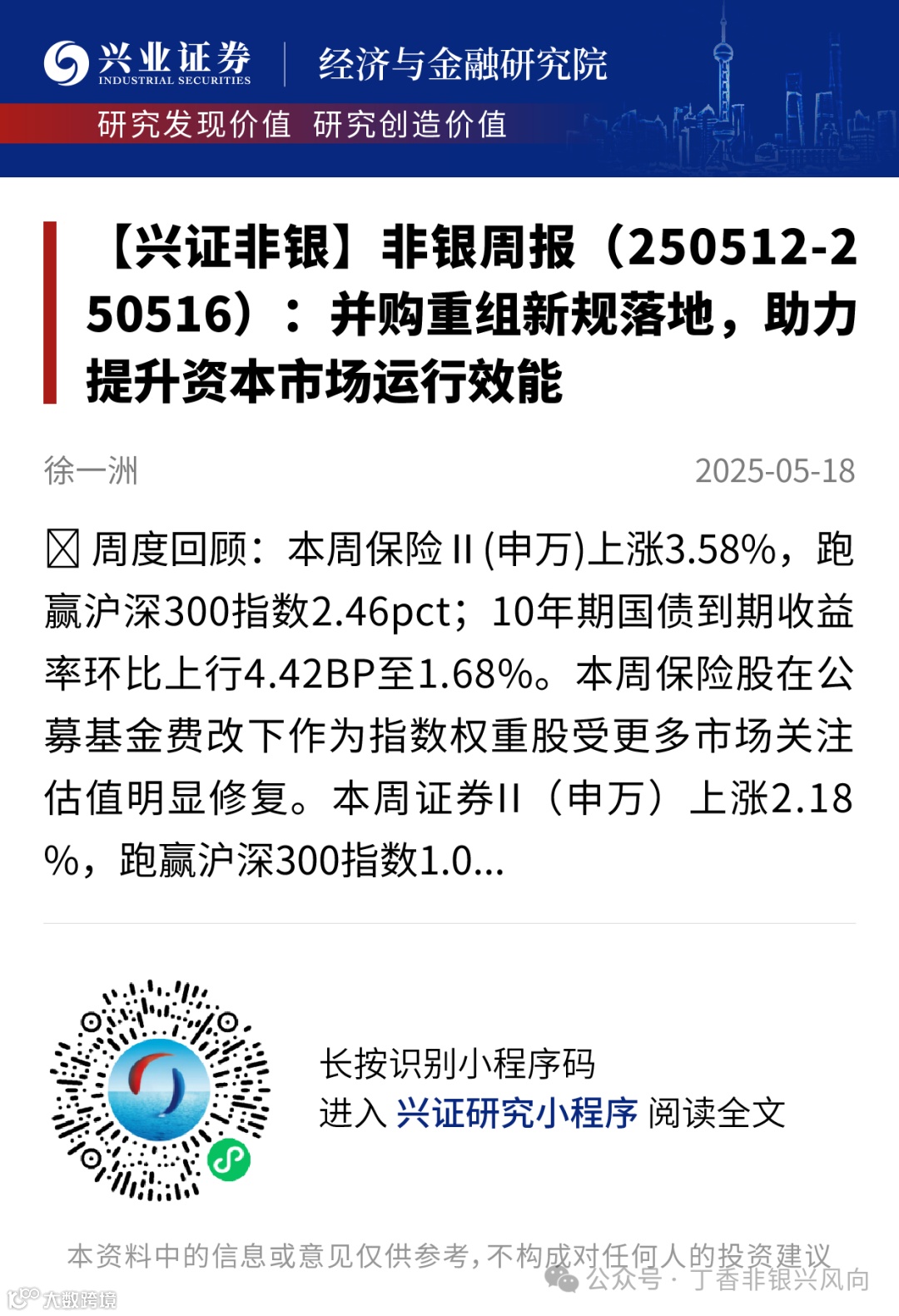 我们发布了《非银周报(250512-250516):并购重组新规落地,助力提升资本市场运行效能》,欢迎阅读!