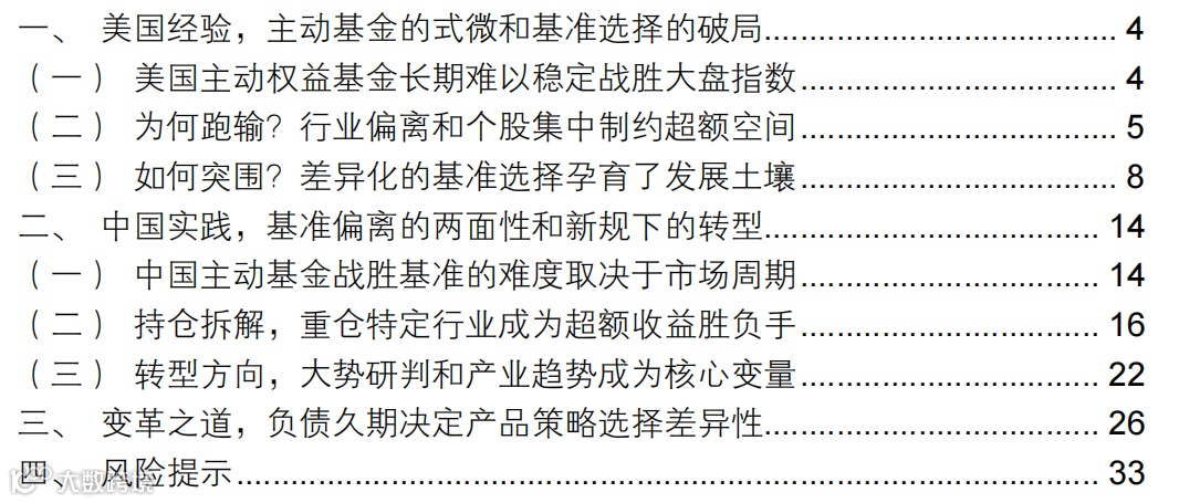 市场周期研判和寻找产业趋势成为国内主动基金超额收益的核心变量。我们认为中美主动投资核心差异在于国内经济动能转型孕育了更多产业投资机会,在景气度上行周期中能够实现估值和业绩的双击。从过去一轮牛熊周期来看,在上行周期中跳出基准寻找投资机会能够为主动基金兑现超额收益的同时控制跑输基准的概率,而熊市期间的基准偏离则呈现明显的负向贡献。基于此,未来主动投资策略核心一方面在于对市场周期的研判,在上行周期通过把握产业趋势在基准之外挖掘超额收益能够提升跑赢概率;另一方面在于寻找创新前沿产业发展方向,通过增配长期趋势上行的产业提升投资的胜率。