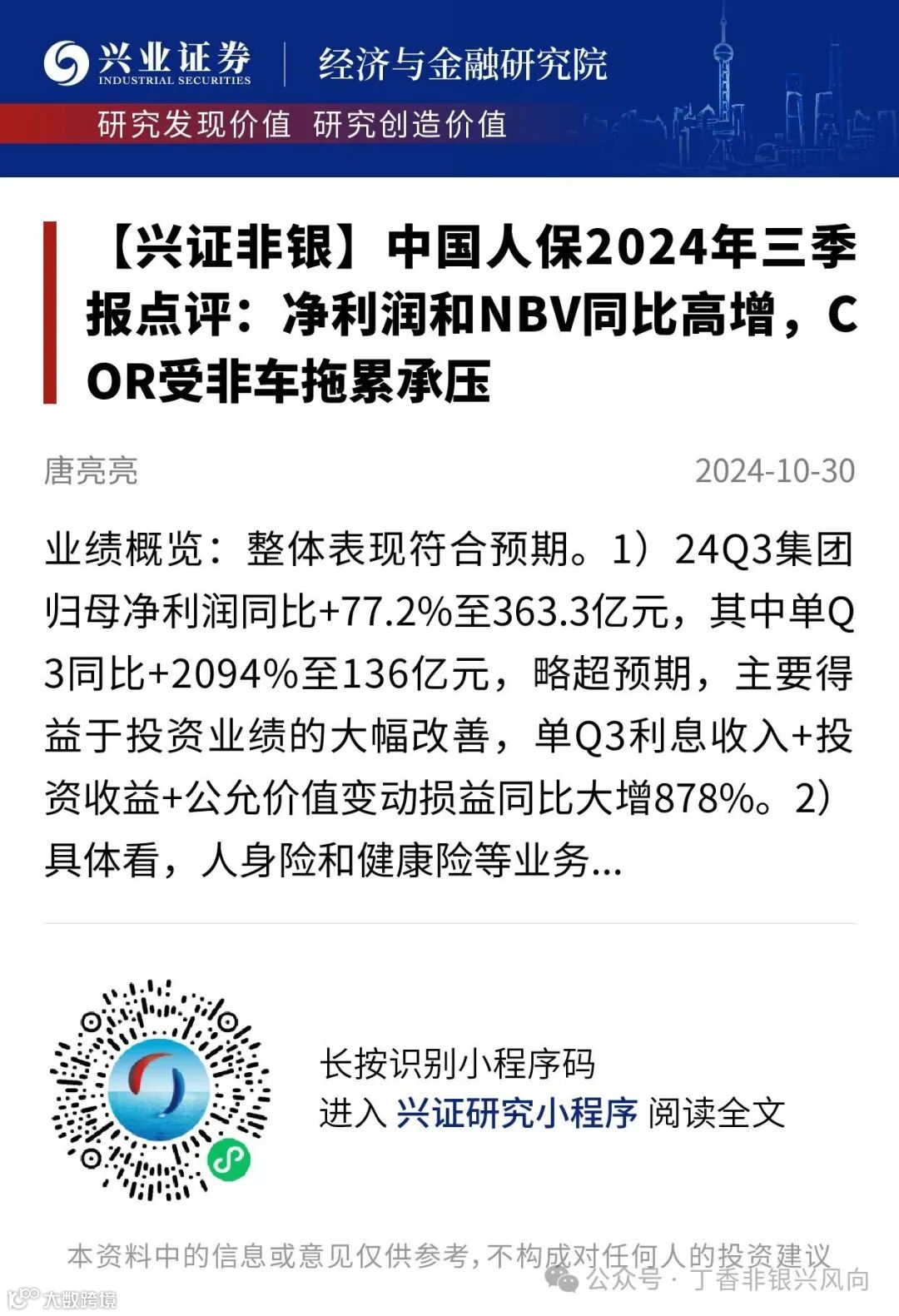 证券研究报告:《中国人保2024年三季报点评:净利润和NBV同比高增,COR受非车拖累承压》