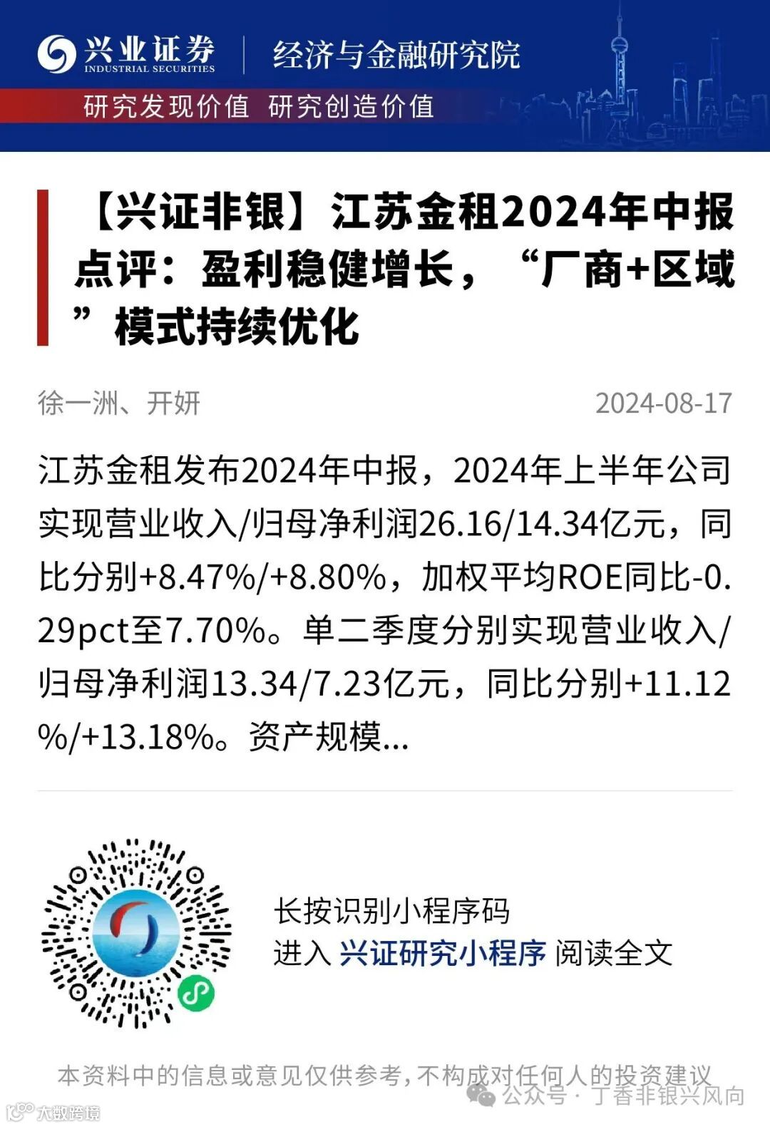 证券研究报告:《江苏金租2024年中报点评:盈利稳健增长,“厂商+区域”模式持续优化》