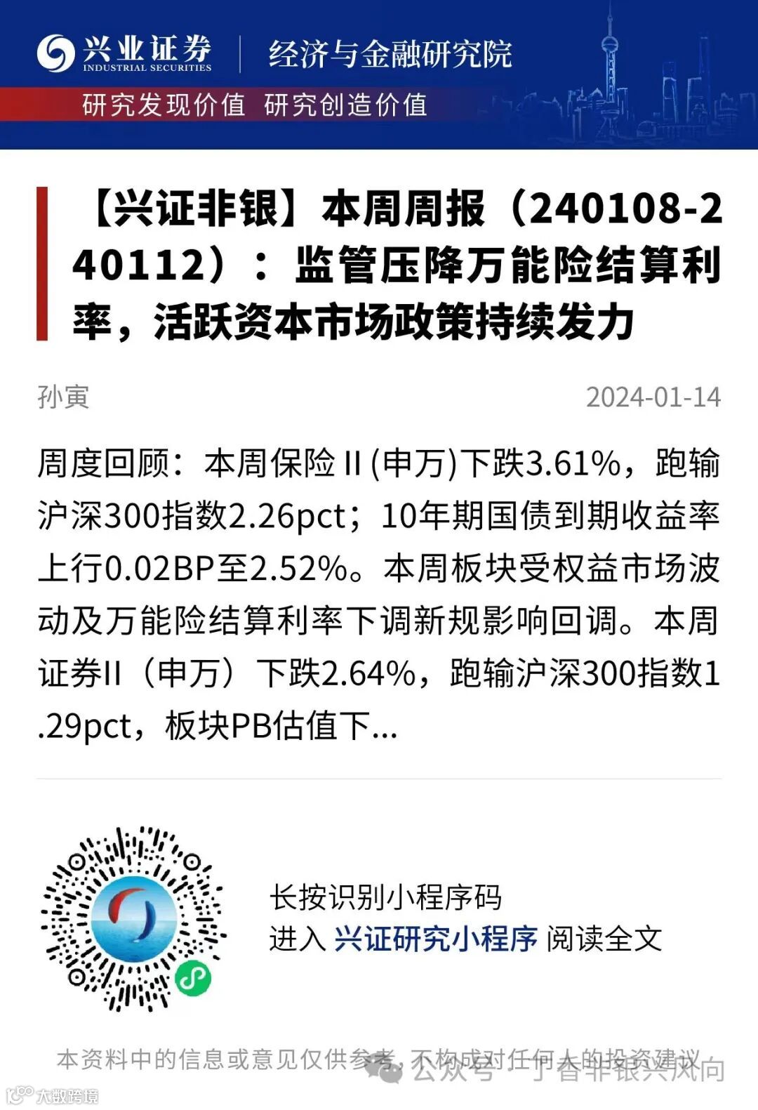 我们发布了《兴证非银周报(240108-240112):监管压降万能险结算利率,活跃资本市场政策持续发力》,欢迎阅读!