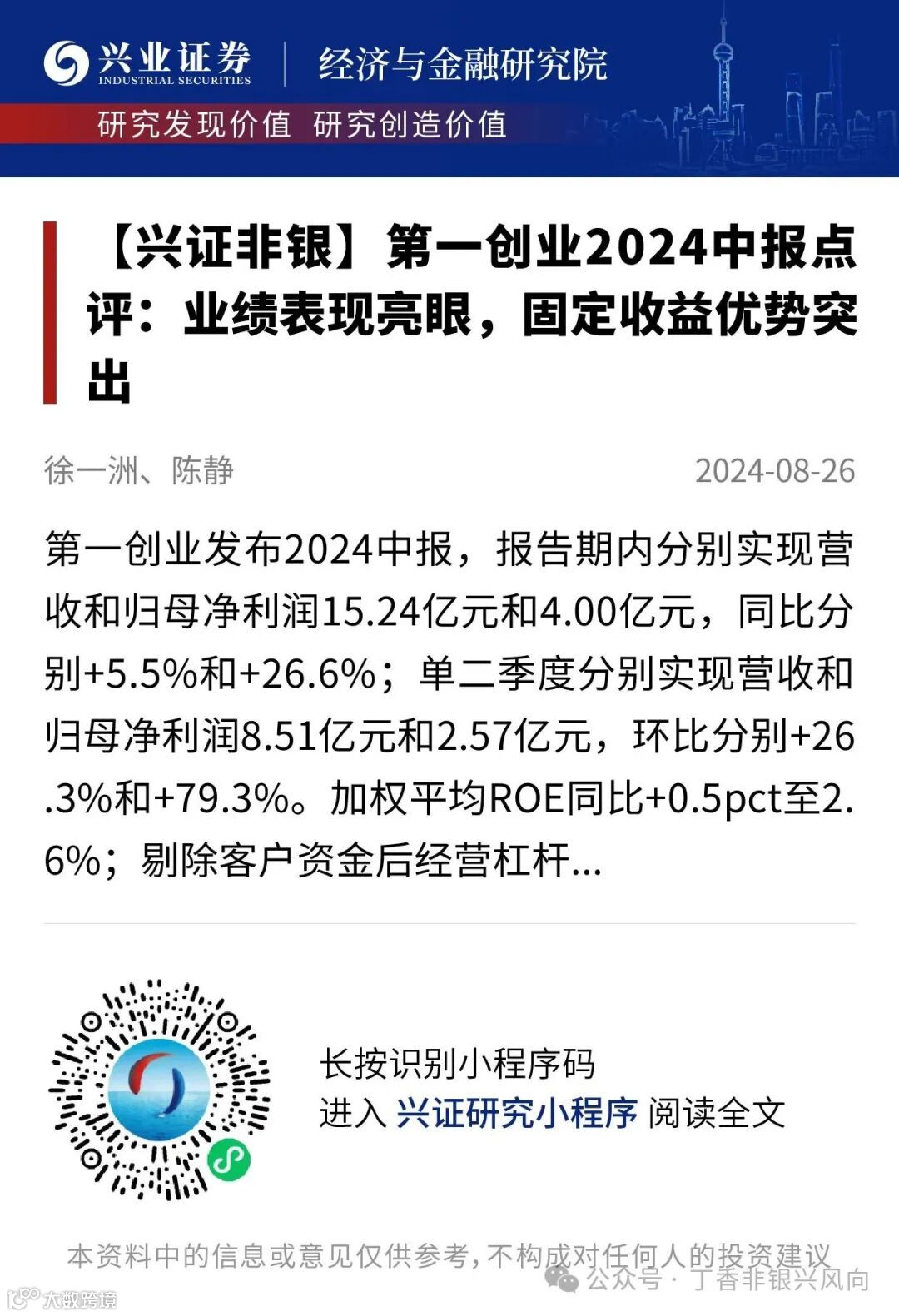欢迎阅读:《【兴证非银】第一创业2024中报点评:业绩表现亮眼,固定收益优势突出》