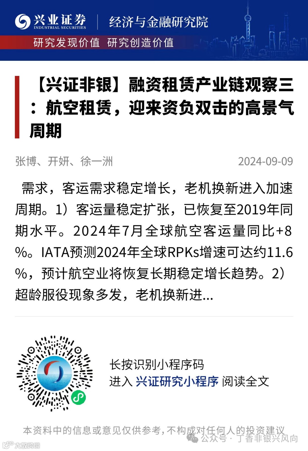 欢迎阅读:《【兴证非银】融资租赁产业链观察三:航空租赁,迎来资负双击的高景气周期》