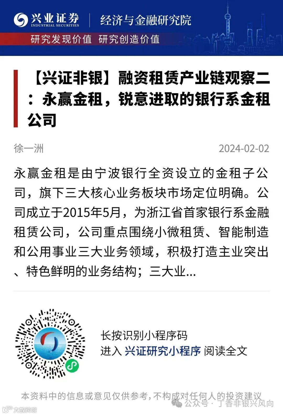 欢迎阅读:《【兴证非银】融资租赁产业链观察二:永赢金租,锐意进取的银行系金租公司》