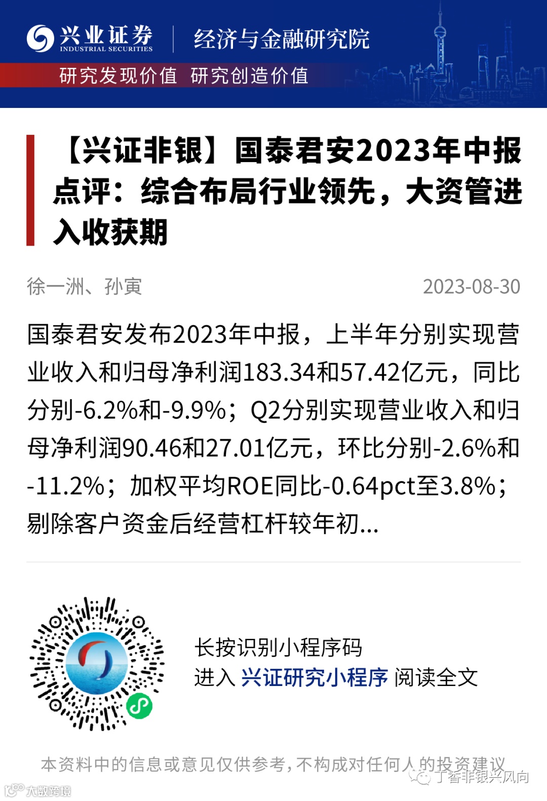 证券研究报告:《国泰君安2023年中报点评:综合布局行业领先,大资管进入收获期》