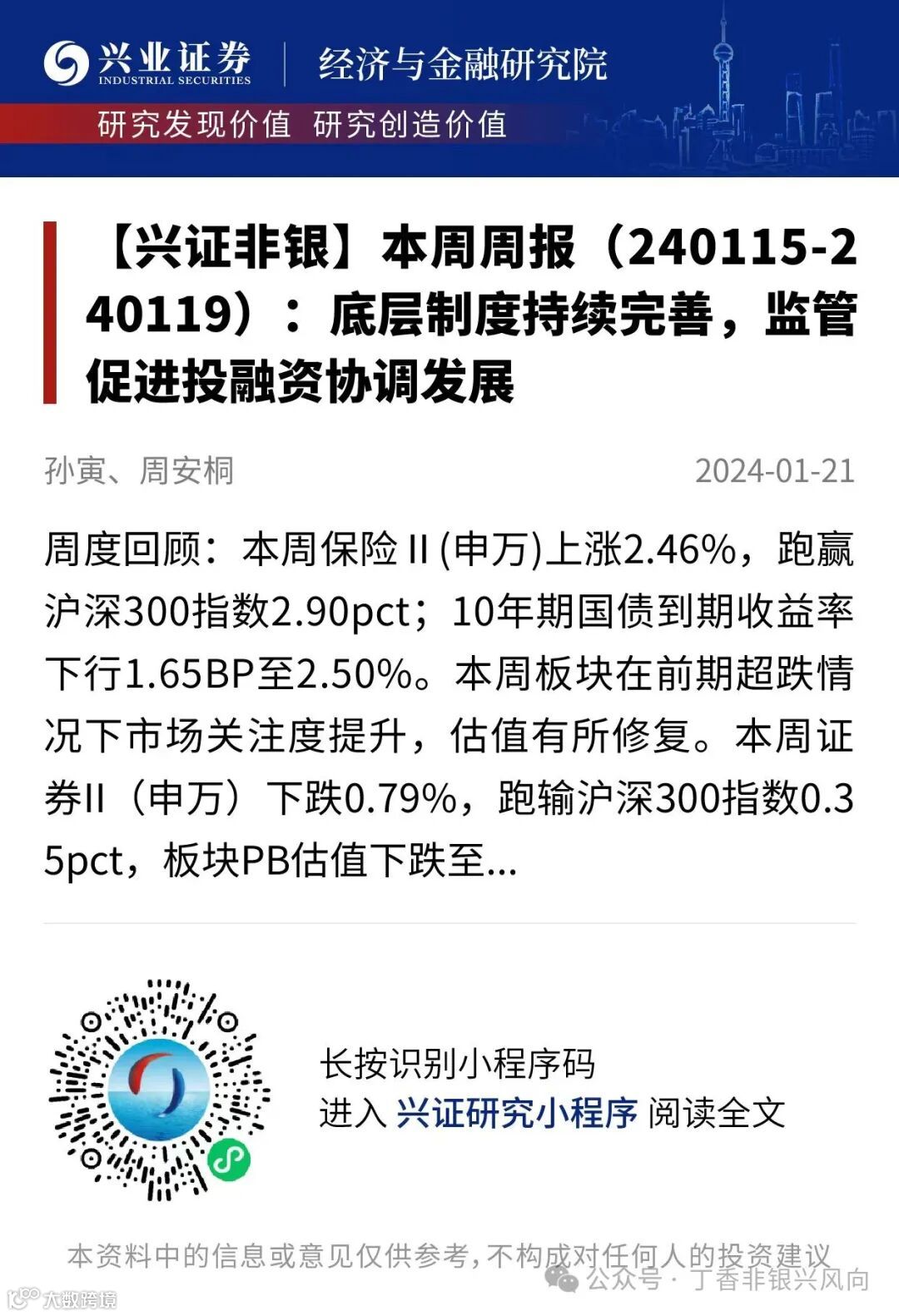 我们发布了《兴证非银周报(240115-240119):底层制度持续完善,监管促进投融资协调发展》,欢迎阅读!