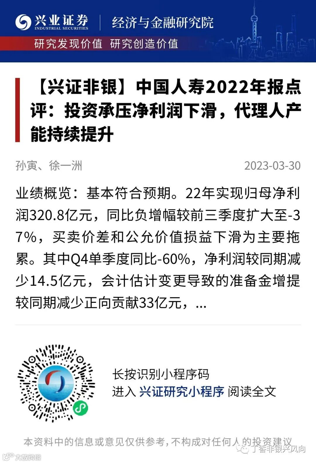 证券研究报告:《中国人寿2022年报点评:投资承压净利润下滑,代理人产能持续提升》