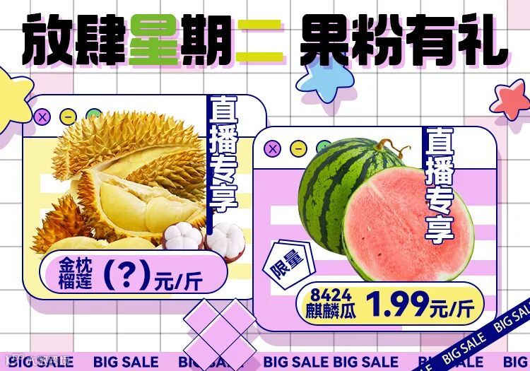 👉 本周直播 重点预告 👇【爆款果品直播间限时福利】👇 【直播专享①】金枕榴莲(?)元/斤,直播间揭秘福利 【直播专享②】8424麒麟瓜1.99元/斤限量秒杀 👇【幸运抽奖】👇 金枕榴莲折上折 观看直播即可参与抽奖 金枕榴莲5元优惠券幸运抽奖 更多精彩活动 👇请点击图片进入直播间👇
