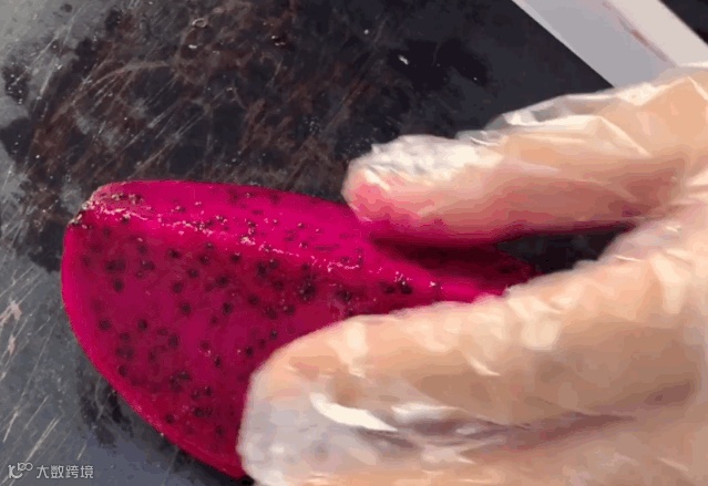 剥开红艳艳的外衣,映入眼帘的是紫红色的果肉