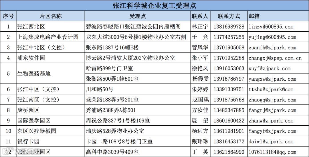 张江科学城分12个片区设置了相应的受理点,明确了联系人及联系方式。