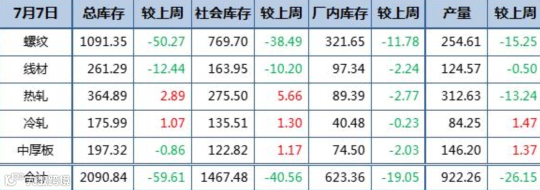 螺纹钢总库存共下降50.27万吨至1091.35万吨,其中社会库存下降38.49万吨至769.7万吨,钢厂库存下降11.78万吨至321.65万吨;线材两库库存同步下降,总库存共减少12.44万吨至261.29万吨。热轧板卷社库增5.66万吨至275.5万吨,厂库降2.77万吨至89.39万吨,总库存共增加2.89万吨至364.89万吨,冷轧板卷总库存小增、中厚板微降。