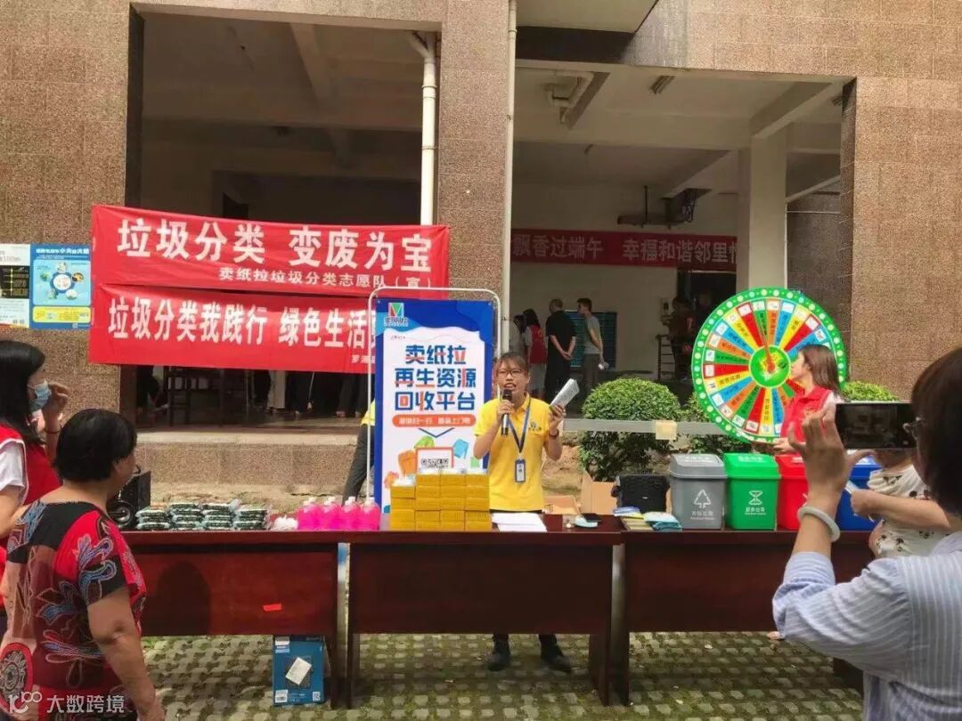 “两网融合”:以“卖纸拉”互联网+再生资源回收模式运行,生活垃圾投放屋在定时定点收集分类生活垃圾的同时将居民投放的可回收物,通过“卖纸拉”回收平台建立的账户,按品类进行现场称重或上门回收,按重量赋予“环保金”,在现场以现金或微信直接到账发放至居民手中,并获得相应环保积分。居民可通过“环保积分”到“卖纸拉商城”或“卖纸拉回收服务站”(筹备阶段)消费网站兑换商品。“卖纸拉”以再生资源变现、上门回收、商品免费配送、优惠价格等优势鼓励广大居民参与生活垃圾分类。