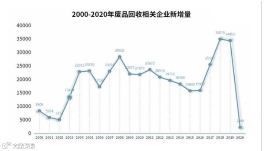 然而自2000年开始,废品回收行业的相关企业数量开始不断波动。在2017年开始,废品回收类企业数量的新增速度明显加快,在2019年更是达到了3.4万家,与2000年新增量相比,增加了410%!