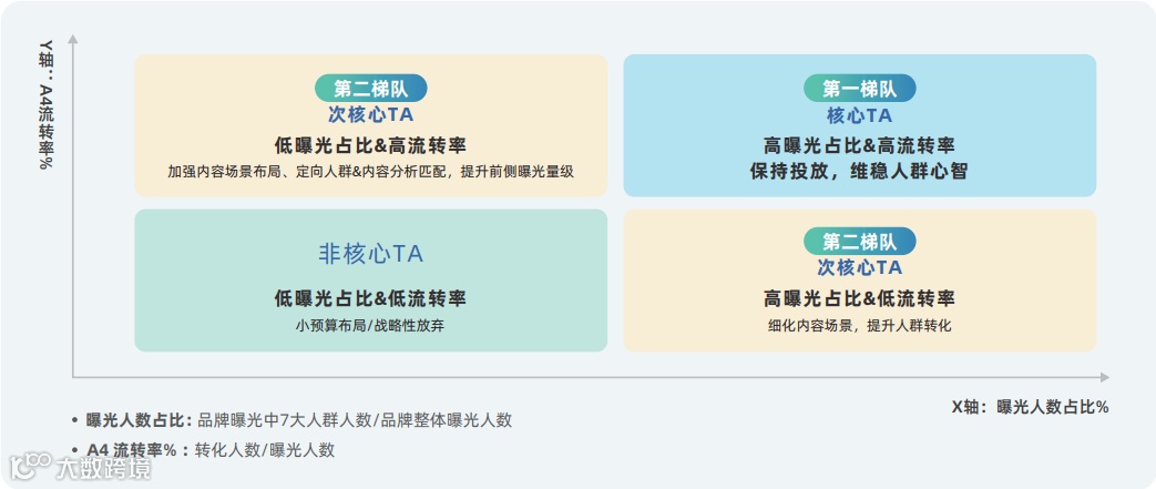 不同品牌的不同细分类目产品可匹配到七大特色人群,在四象限中根据曝光和流转率的不同判断核心TA和次核心TA,从而分梯队进行差异化运营。
