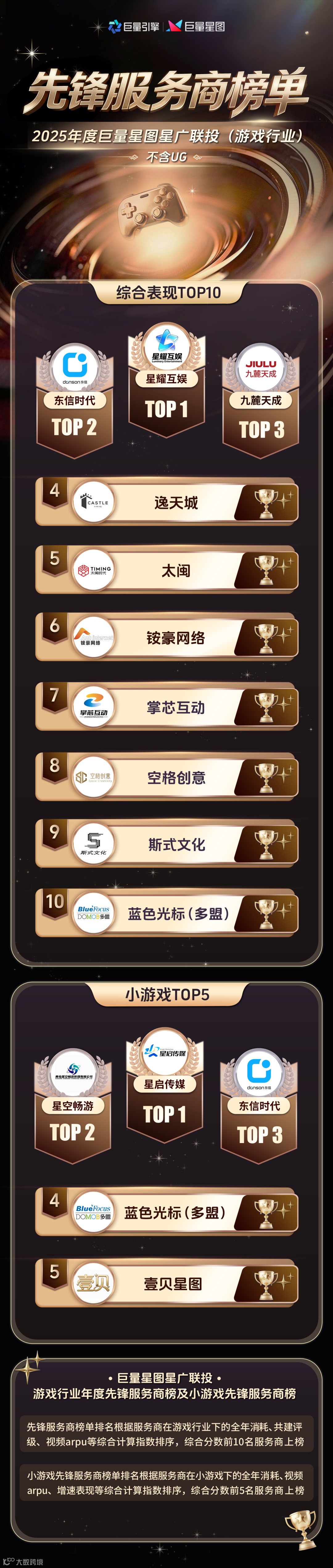 他们是游戏营销赛道的“先锋”与“探索者”,对游戏行业生态有着深刻的理解和独到的洞察。上榜服务商精于将原生、优质的游戏内容与精准的广告投放策略深度绑定,高效激发玩家的下载与付费意愿。他们不仅懂得如何与核心玩进行“内容沟通”,更能通过星广联投撬动泛用户的巨大潜力,为游戏产品在不同生命周期的营销诉求提供定制化解决方案,助力游戏厂商在激烈的市场竞争中抢占先机,实现用户规模与收入的双重爆发。