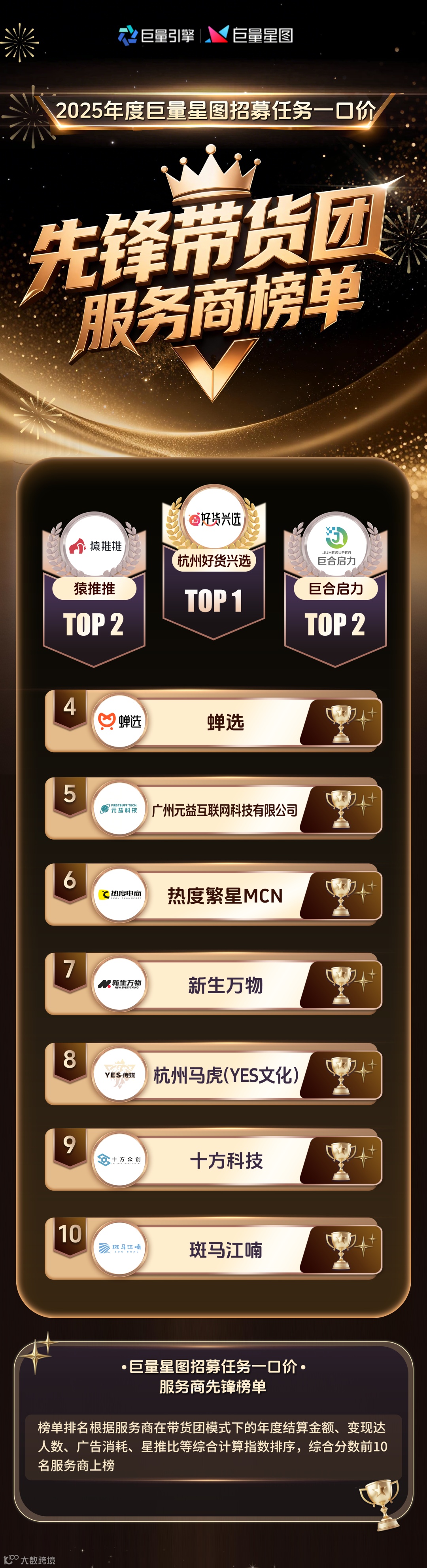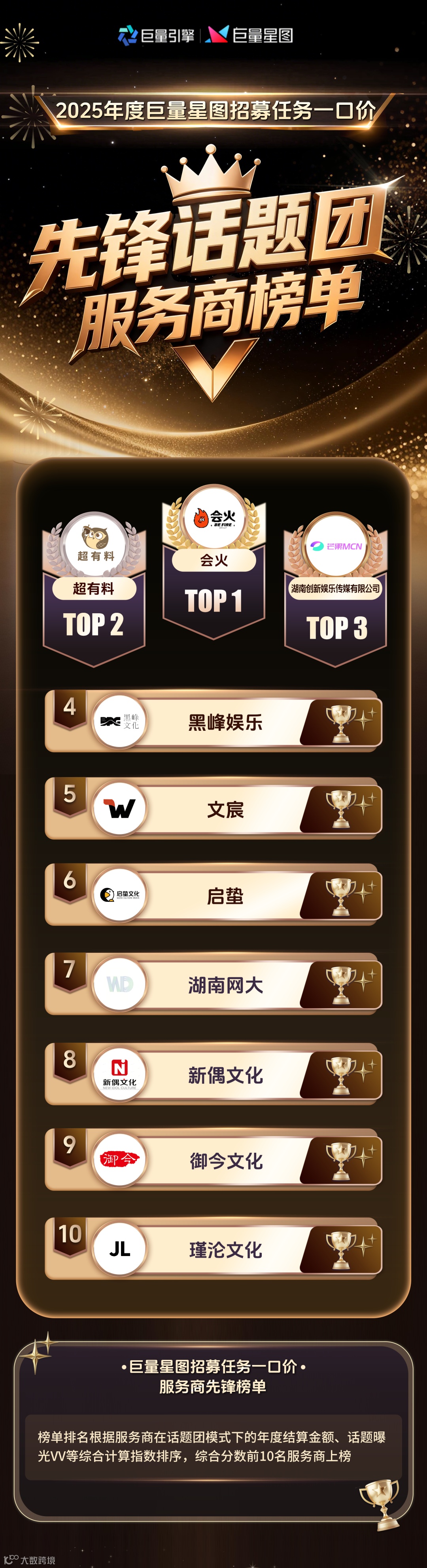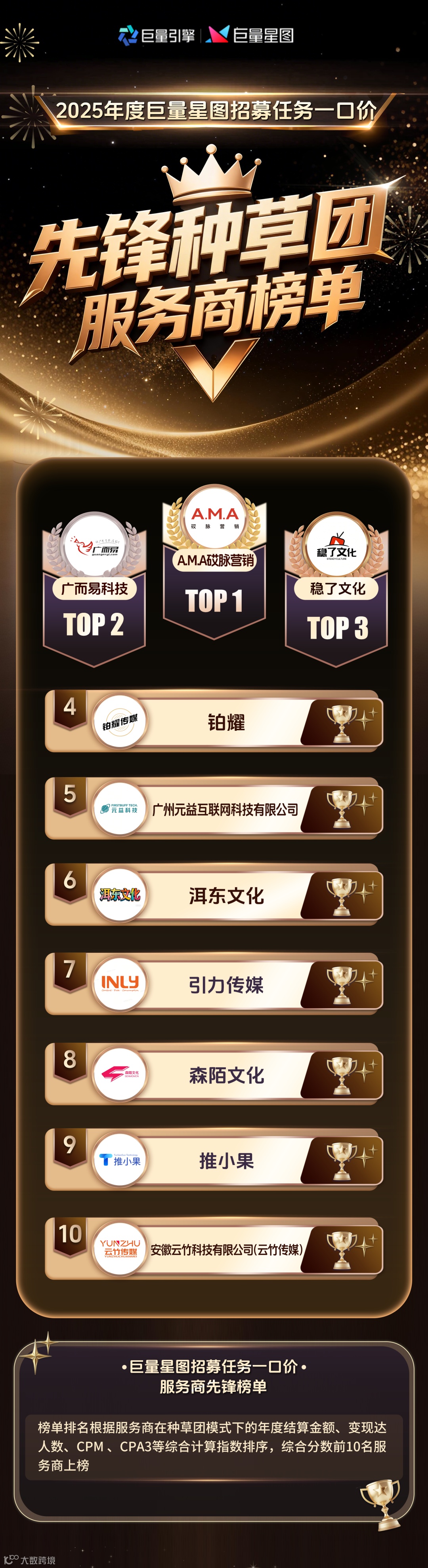 在巨量星图的广袤生态中,服务商伙伴们始终是不可或缺的同行者与共建者。他们以专业的精神为帆,以卓越的履约为桨,将达人内容创意化为真实可感的商业价值。基于25年度多维数据与专业评估,我们正式推出2025年度巨量星图任务服务商榜单,致敬每一位在达人营销星辰大海中劈波斩浪的领航者!