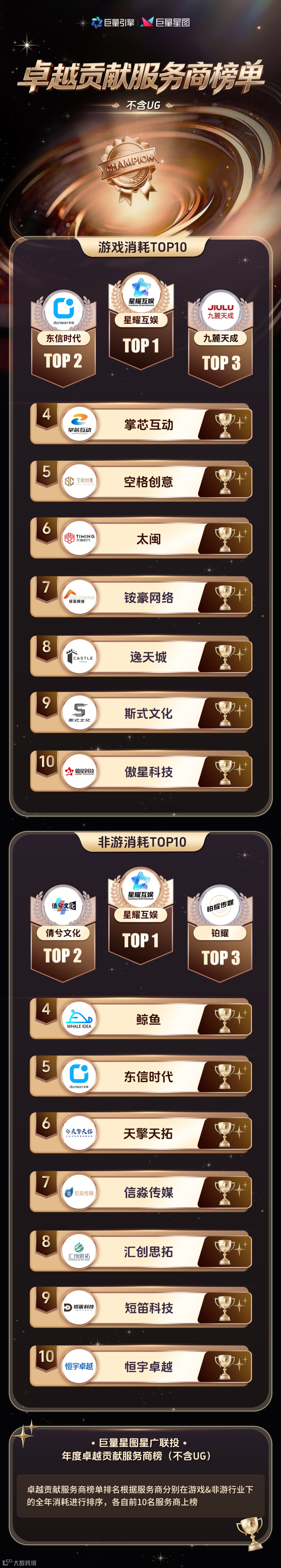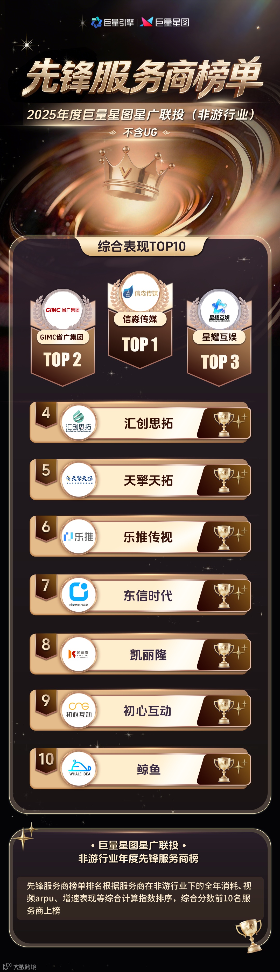 他们是星广非游规模化的“加速器”与“赋能者”,致力于打破内容种草与效果广告之间的壁垒。上榜服务商在接单能力、创意能力、非游行业探索与自身成长性上有突出表现,他们深谙非游行业的营销痛点,善于运用“内容种草在前,广告追投在后”的组合拳,实现客户声量与生意增长的同频共振。