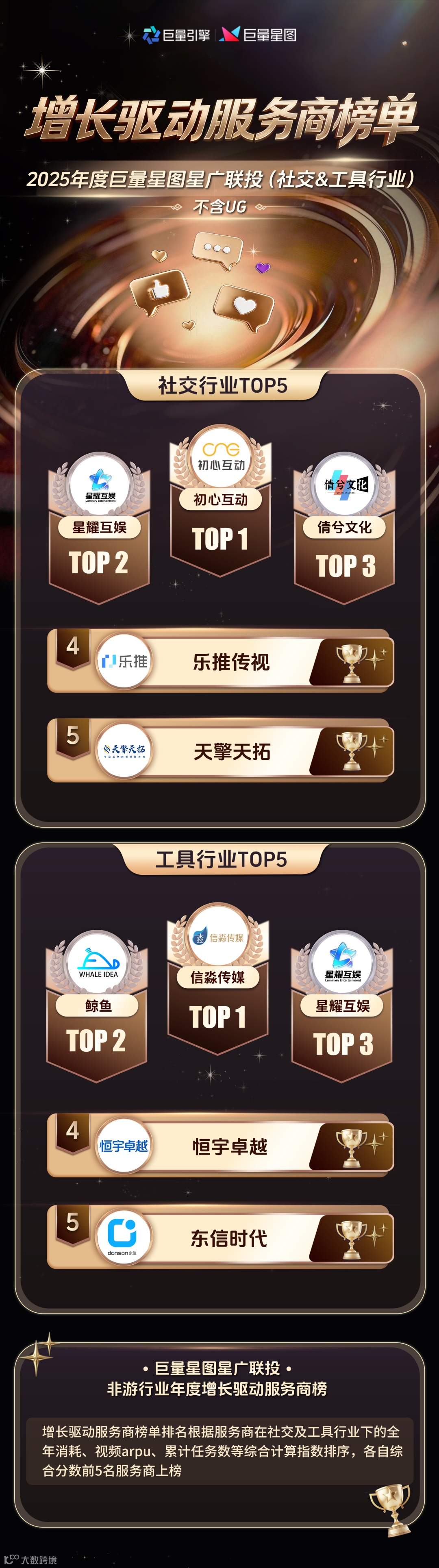 他们是助力非游核心两大行业——社交及工具高速增长的“驱动引擎”。上榜服务商通过星广联投的产品能力,为社交及工具类APP高效获取规模化、高质量的新用户。他们不仅关注短期的下载激活,更着眼于长期的用户留存与活跃,提供从拉新、促活到商业化变现的全链路增长方案,成为产品破局增长、穿越周期的坚定伙伴。