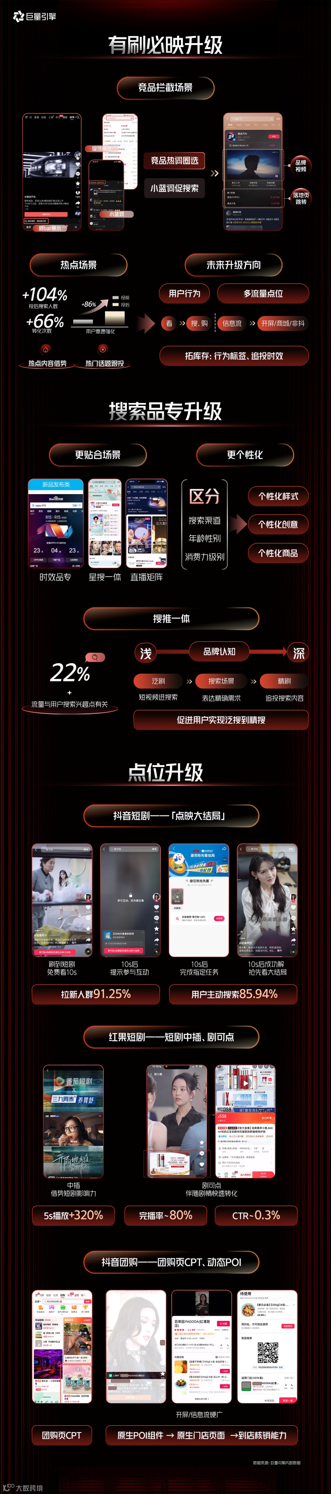 具体来讲,在曝光产品上,代理商应关注「有刷必映」和「搜索品专」,助力品牌实现精准人群触达,承接多元化搜索意图。同时,抖音短剧、抖音团购、红果短剧等新增点位也为品牌提供了多元沟通场景。