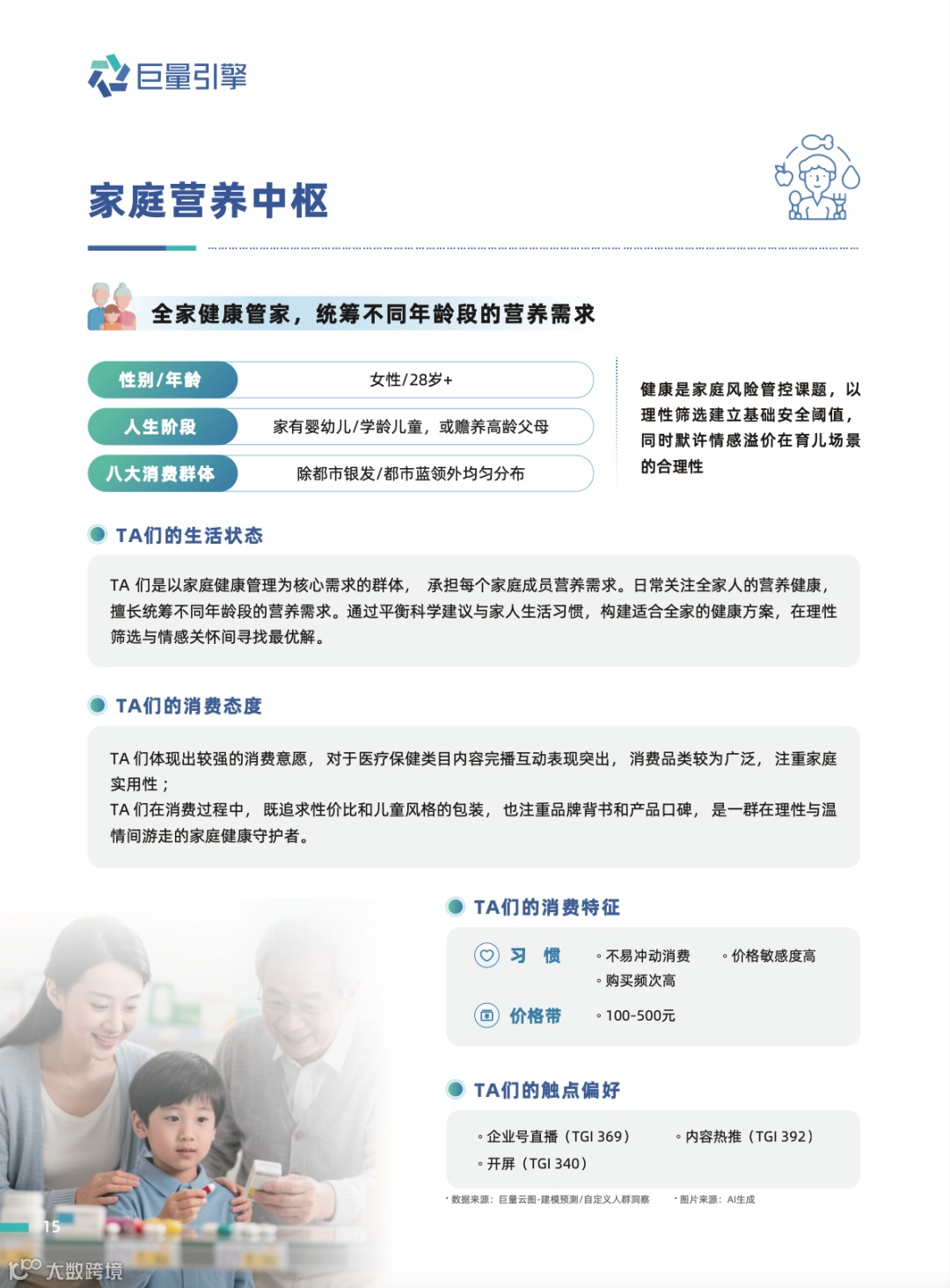 【家庭营养中枢】: 作为全家健康管家,他们在科学建议与家人习惯间寻求平衡,决策兼具理性与情感。例如,为孩子选保健品时,既看重品牌背书和口碑,也会考虑孩子对包装和赠品的喜爱;为老人挑选时,则关注产品设计的实用性(如便携分装、易吞咽液体剂型)。