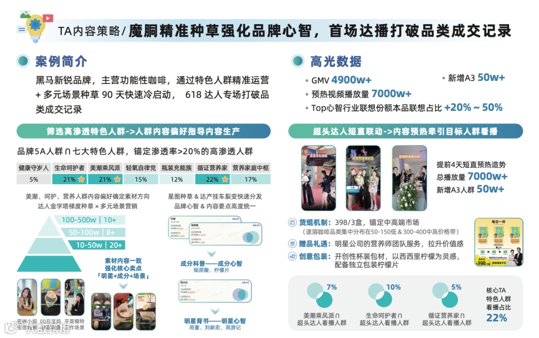 魔胴咖啡: CEO袁志闻高度认可项目价值,说到“项目聚焦追求健康与品质生活的群体,结合达人合作与话题营销,有效激发兴趣、引导互动、打造口碑,实现从曝光到转化的高效链路。”618期间,魔胴通过特色人群运营+多元场景种草,90天快速冷启动,首场抖音达人直播即打破黑咖啡品类成交记录,销售额突破4900万元,新增A3人群超50万。(数源:巨量引擎本地业务客户投放案例,5.13-6.18)