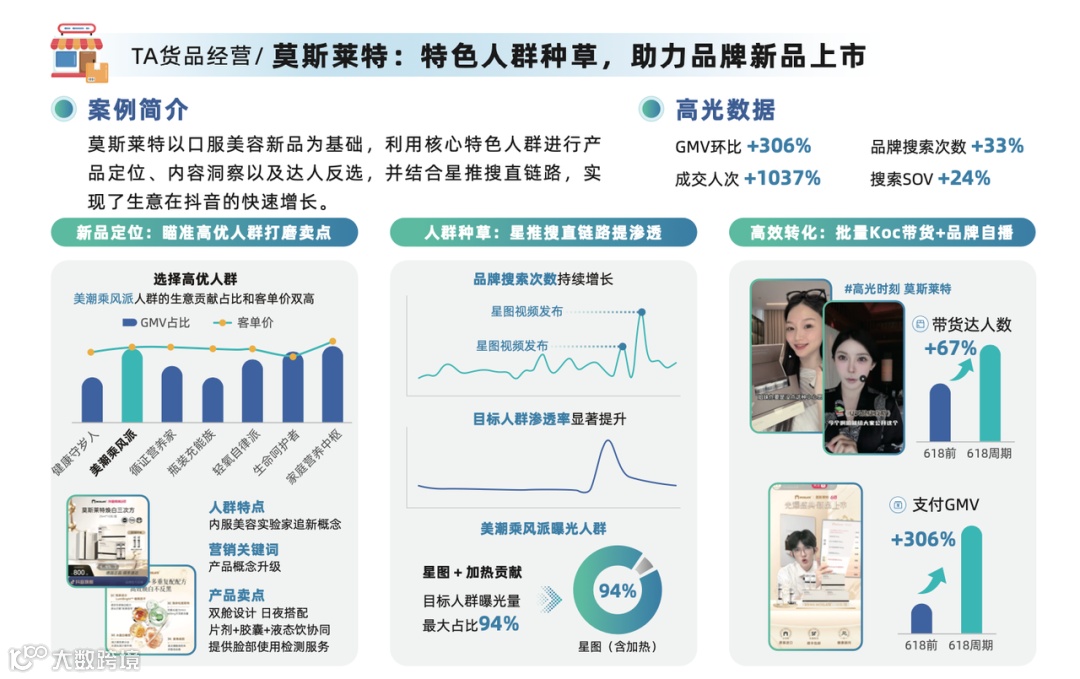 新锐品牌Moslate莫斯莱特: 以口服美容新品为基础,利用核心特色人群进行精准产品定位,结合抖音“种草-推荐-搜索-直播”(星-推-搜-直)转化链路,实现生意快速增长。618期间,新品GMV环比猛增306%,成交人次增长1037%,品牌搜索次数提升超33%。 品牌中国电商总经理有杰表示:“放眼看2025年的中国消费市场,抖音无疑是所有渠道中拥有最快结果反馈的渠道,我们品牌今年希望在抖音完成两个亿元单品的打造。”(数源:巨量引擎本地业务客户投放案例,5.13-6.18)