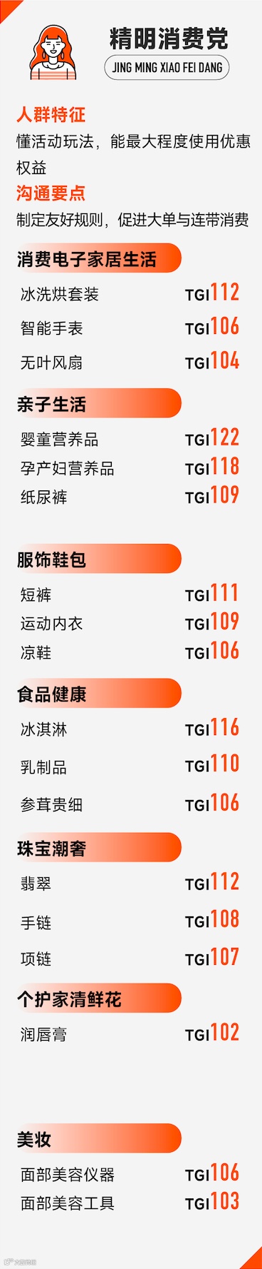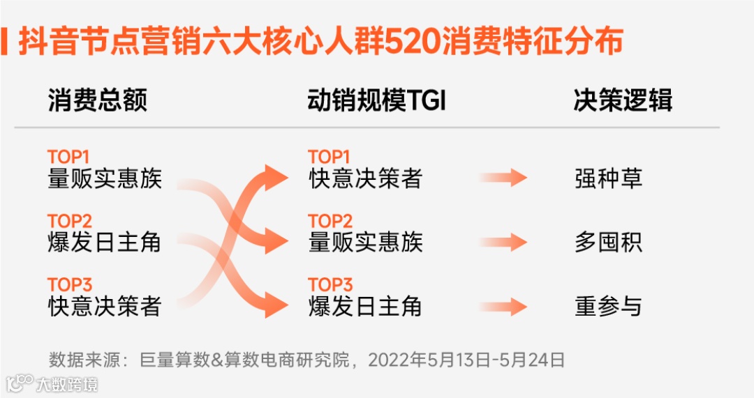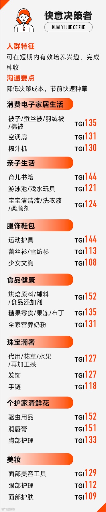 人群对应着节点营销期间消费者的决策逻辑。从抖音节点营销六大核心人群在2022年520节点期间的消费情况看,节点整体呈现出强种草、多囤积、重参与的特征。以下将在回顾六大核心人群核心特征的基础上,推荐与之更匹配的七大行业节点趋势品,助力商家和达人形成有效的货品沟通策略。
