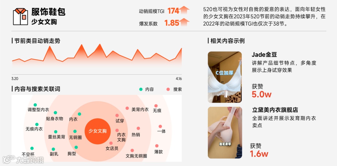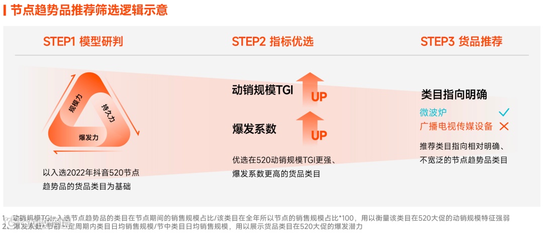 为帮助商家和达人从繁多的节点趋势品中定位到更值得投入货品类目,巨量算数&算数电商研究院在节点规模指数、节前增长指数、节中爆发指数的基础上,综合节点趋势品类在520节点的动销规模TGI,优选出520节点更值得关注的部分节点趋势品类;并通过爆发系数,展现类目在520节点的爆发潜力;最终呈现出品类指向鲜明的节点趋势品,供商家和达人参考。