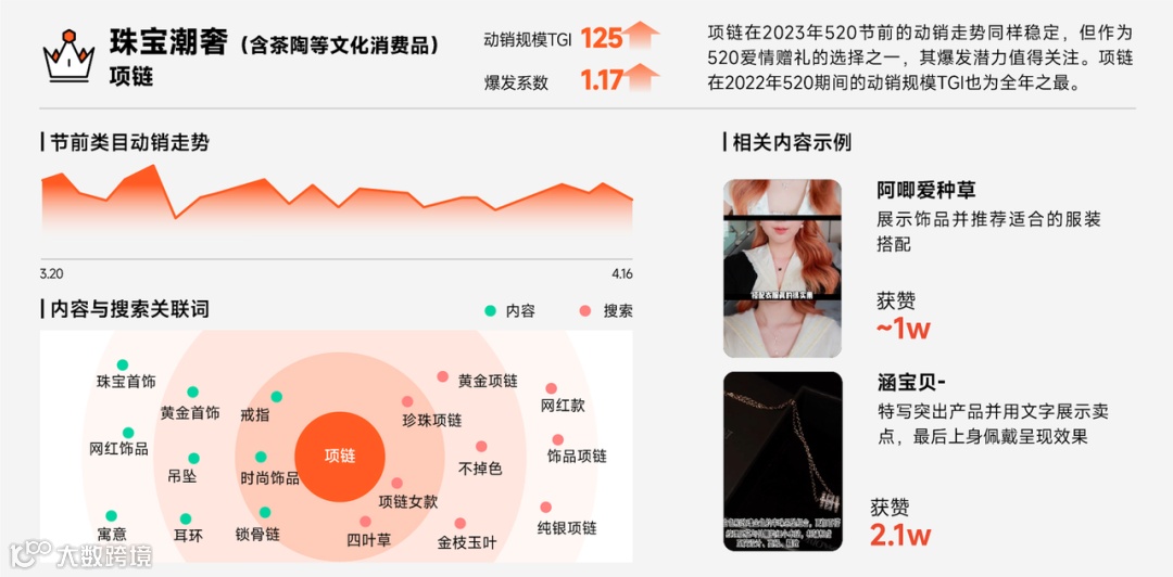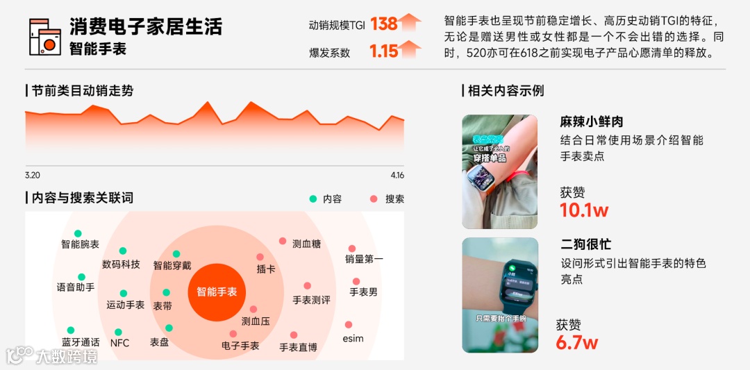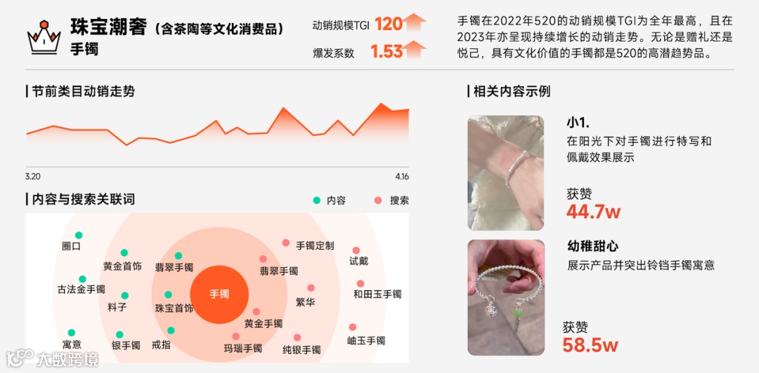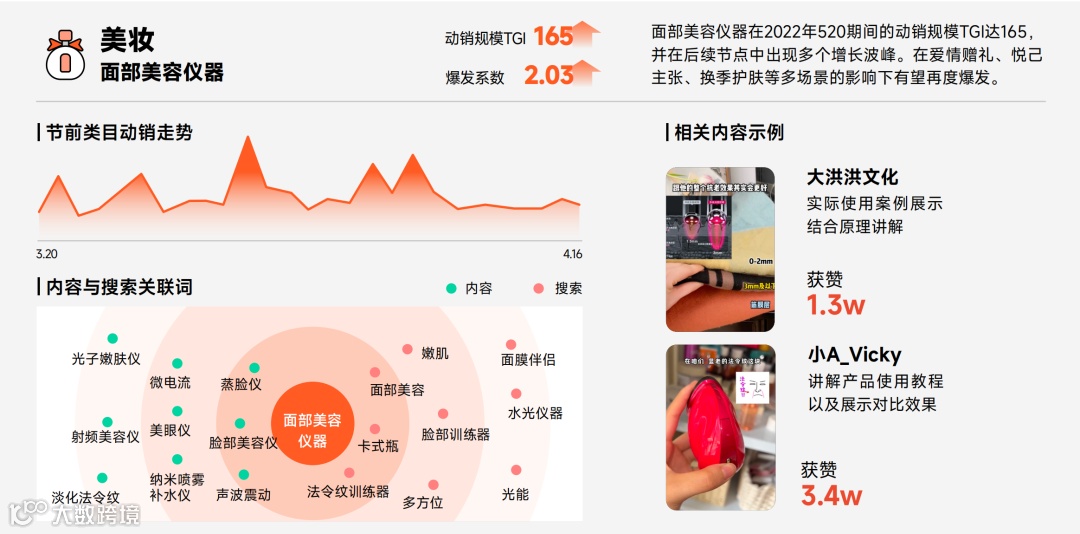 520节点为商家和达人提供了更多爆款打造与新品破圈的机会,美妆用品、消费电子、亲子生活、珠宝潮奢等行业均存在较为明显的节点趋势品动销空间。以下列举了部分520期间典型节点趋势品营销用例,供商家和达人创作参考。