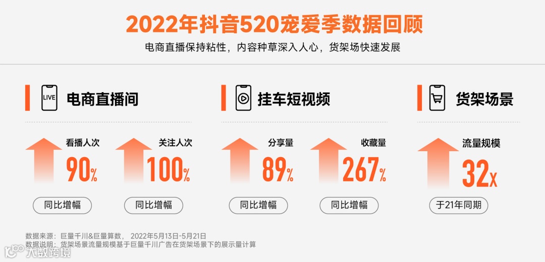 本次研究将基于2022年抖音生态内的「520」节点营销相关数据表现,对流量 · 货品 · 人群三大维度的经营要点展开扼要分析,并引入「节点趋势力」模型的趋势品类研判能力,为电商从业者提供以货品为核心的增长机会洞察。