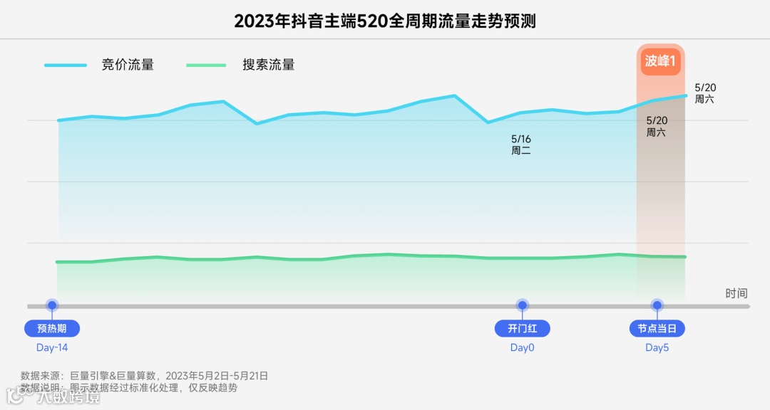 2023年520节前竞价流量与搜索流量均相对平稳,整体利于蓄水转化,波峰预计出现在5/20与5/21,并可与即将到来的618形成联动。