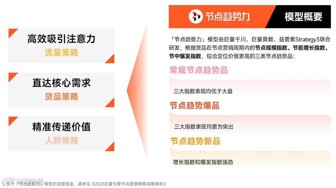 在近期发布的《2023巨量引擎节点营销策略洞察报告》中,巨量千川&巨量算数携手益普索Srategy3打造了「节点趋势力」模型,帮助商家和达人定位节点营销中价值更高的节点趋势品类,并提出了高效吸引用户注意力、直达用户核心需求、精准传递价值的大促经营策略制定要点。