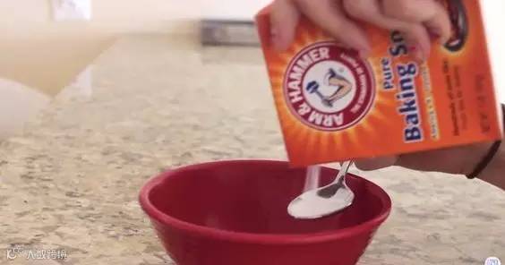 柠檬切开榨汁,在小碗里倒入苏打粉,并将新鲜柠檬汁倒入,混合。