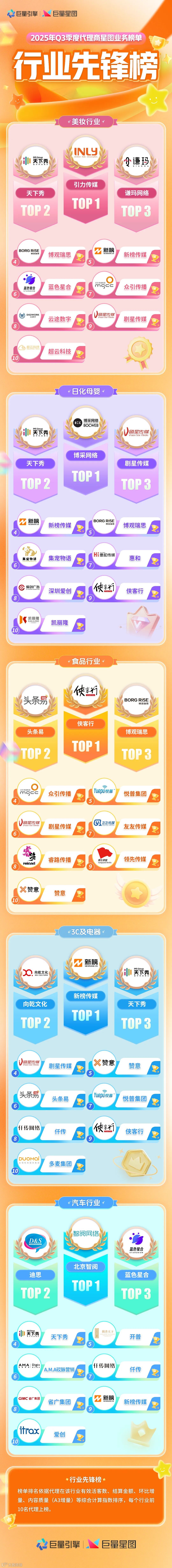 行业先锋榜精准聚焦美妆、日化母婴、食品饮料、3C及电器、汽车五大核心赛道,完成对市场关键阵地的精准覆盖。上榜代理商凭借在各领域客户深耕数量、市场规模占比、行业增长速率、内容营销效能等核心指标的卓越表现,定义细分市场的服务标准。