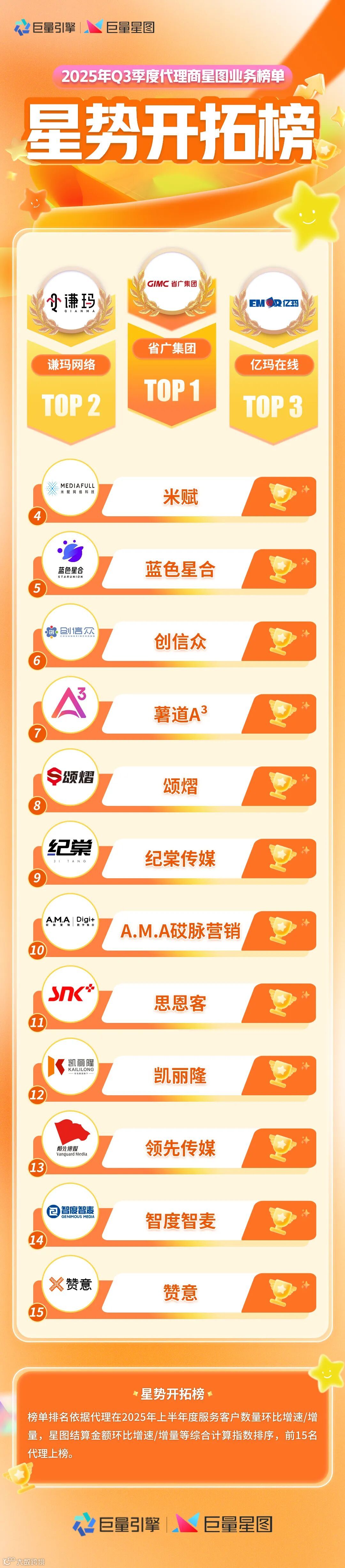 榜单聚焦 “拓客增速 + 营收增量” 双核心,通过服务客户数量环比增速与增量、星图结算金额环比增速与增量两大维度,筛选出在 Q3季度 实现市场突围的成长型代理商。
