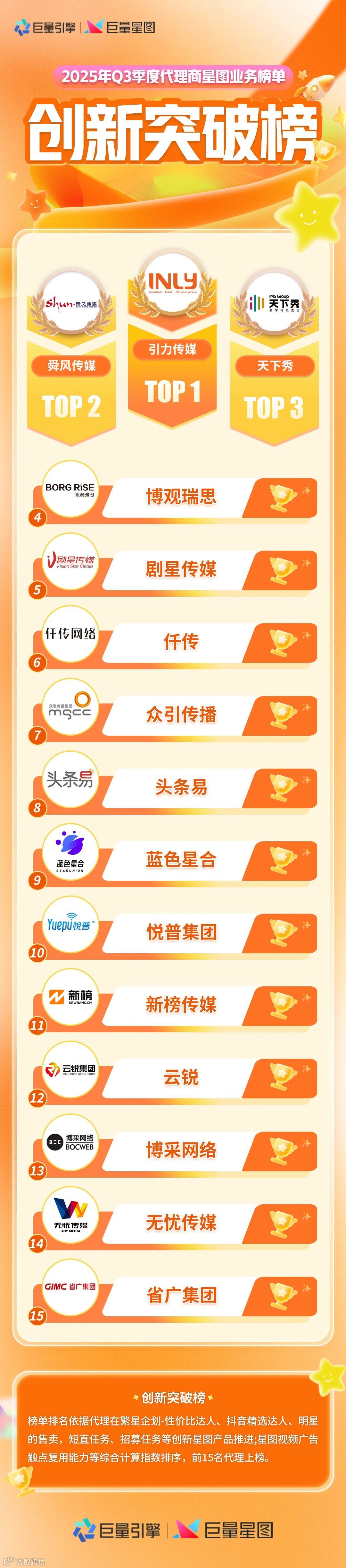 2025年Q3季度星图代理商榜单的发布,通过 “行业先锋 — 创新突破 — 星势开拓” 的三维评价体系,立体描绘出达人营销行业的发展全景:行业先锋榜夯实生态根基,创新突破榜引领进化方向,星势开拓榜激活增长动能。这三大榜单不仅是对上榜机构的权威认证,更形成了 “夯实基础 — 创新迭代 — 规模增长” 的行业发展指南,为星图代理生态的健康发展注入持续动力。