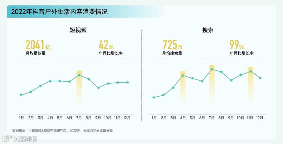 2022年户外生活相关内容在抖音上的受欢迎程度持续增长,月均播放量高达 2041 亿次,同比增长 42%。除短视频种草外,用户主动搜索户外生活内容的意愿也更加强烈,月均搜索量达到 725 万次,同比增长 99%。