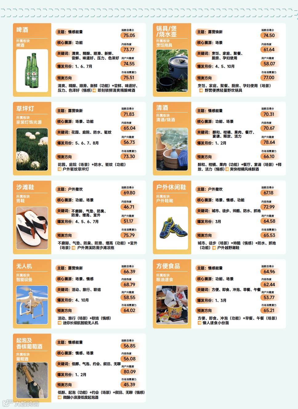 巨量算数 & 算数电商研究院综合趋势赛道评估模型,筛选出了 38 个户外生活行业趋势赛道,覆盖运动用品、户外用品、箱包、方便食品、酒饮等多板块,我们认为推动品类的创新力集中在功能创新、场景创新和情感创新。