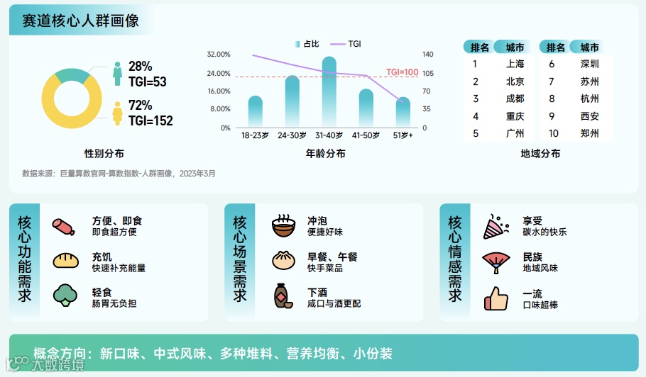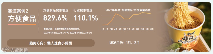 方便食品赛道解读:2022年3月-2023年4月间搜索量同比增长 829.6%,远高于行业整体,月度趋势波动攀升。女性为主,31-40 岁人群占比高;集中在一二线城市。方便食品由于其便宜、快速和方便,逐渐成为出行必备品。正所谓,方便生活,小包装,大营养。在户外出行中,方便食品助你享受更加自由、无拘束的旅程。