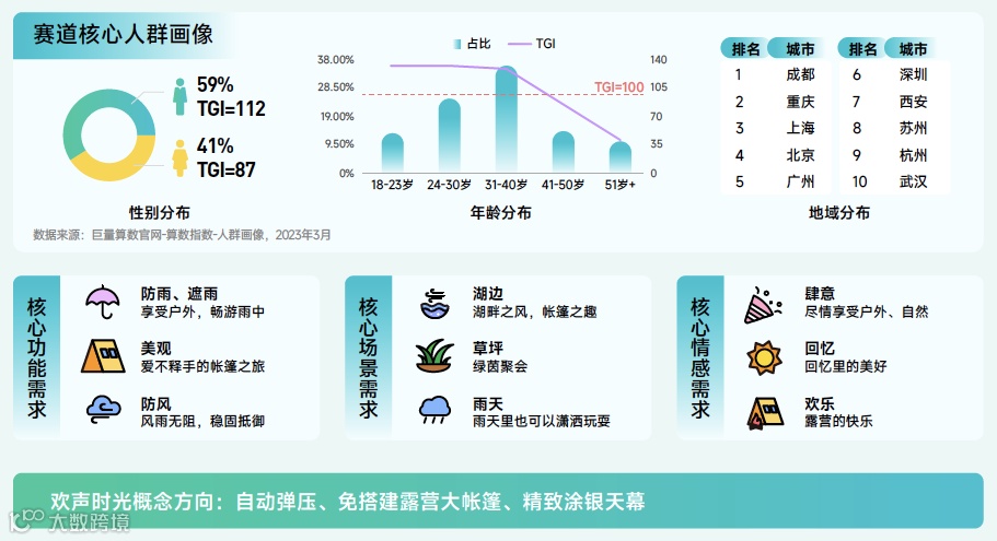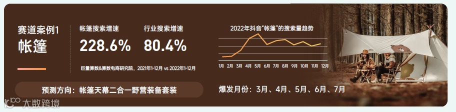 帐篷赛道解读:该赛道抖音2022年搜索量同比增长228.6%,远高于行业整体水平。该赛道的兴趣群体以 31-40 岁的男性为主,主要分布地区涵盖多个热门旅游城市。随着生活水平的提高和对自然休闲需求的增加,多功能帐篷在未来将更受欢迎,防雨、美观和防风等多重特性将满足人们对于舒适和便利的需求。除此之外,在技术创新、多样化产品、个性化定制、环保可持续发展等趋势上,这一领域将有广阔的市场前景。