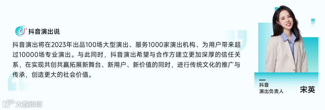 目前,抖音与 100+ 品牌、160+ 内容合作伙伴达成了演出直播的商业合作,过去一年,演出直播在 IP 收入中的占比提升 123%。2023年,抖音演出将出品 100 场大型演出、服务 1000 家演出机构、为用户带来超过 10000 场专业演出,为行业带来新舞台、新用户、新价值。