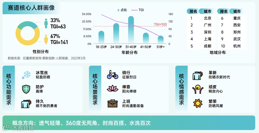 防晒衣赛道解读:搜索量同比增长 161.4%,远高于行业整体,该赛道上半年搜索量逐渐上升,下半年搜索量逐渐下降,6月份搜索量最高。兴趣群体以女性为主,31-40 岁人群占比高,用户集中在一线和高温天气多发城市。未来,防晒衣可能会更加注重轻盈防晒、持久等功能,为消费者提供更好的防护和穿着体验,并向轻薄、智能等方向发展。