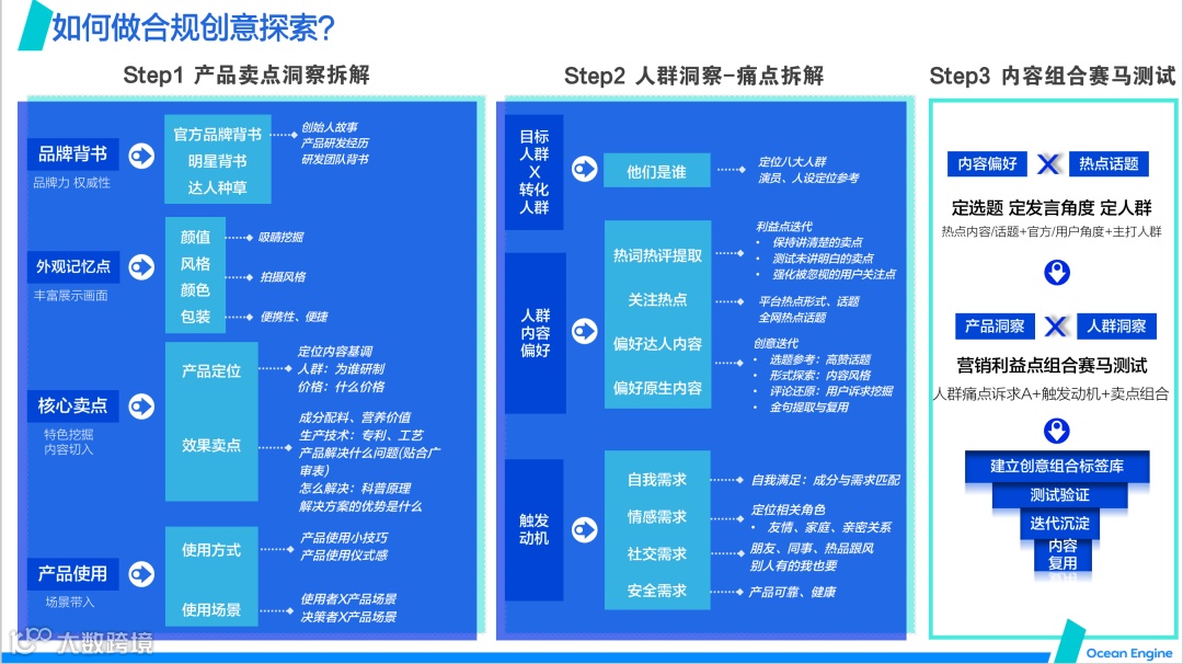 同时,创意探索一定要建立在合规大前提下,通过产品卖点洞察解析、人群洞察痛点拆解、内容组合赛马测试一步步达成,最终产出最高效的好创意。