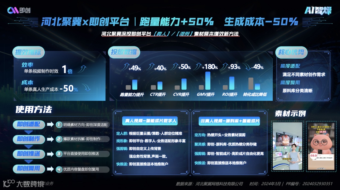 通过即创生产的素材,实现跑量能力提升50%,素材生产成本下降50%